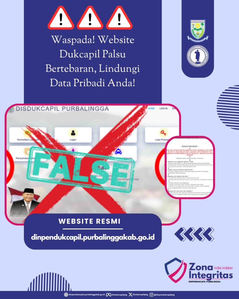 Informasi selengkapnya: https://dinpendukcapil.purbalinggakab.go.id/article/waspada-website-dukcapil-palsu-bertebaran-lindungi-data-pribadi-anda