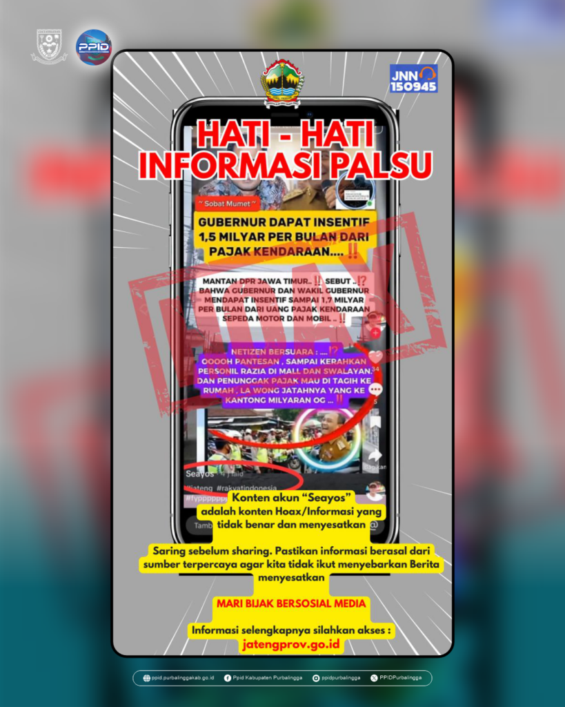 Beredar di media sosial konten dari akun “Seayos” yang menyebutkan bahwa Gubernur menerima insentif miliaran rupiah setiap bulan dari pajak kendaraan bermotor. Informasi tersebut dipastikan tidak benar (hoaks) dan bersifat menyesatkan.